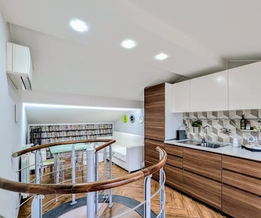 Cozy attic apartment with kitchen, bedroom, and private bathroom, featuring refined furnishings and a sea view for an intimate and evocative stay.